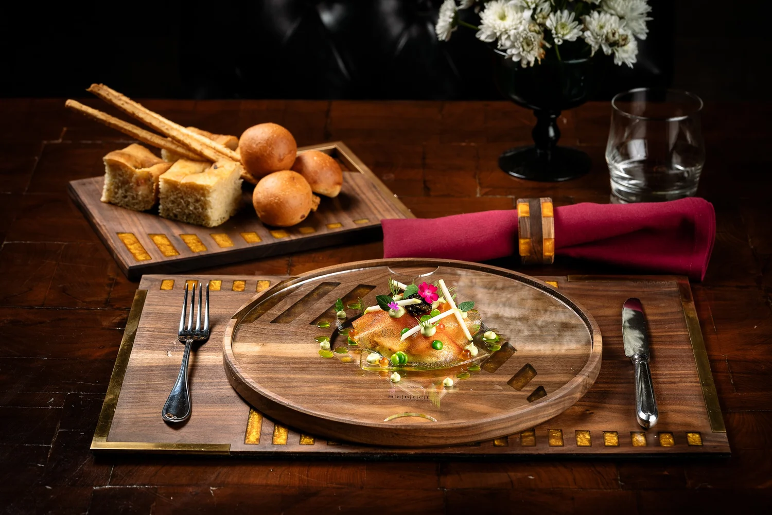 Walnut dinnerware collection inspired by the restaurant's interior